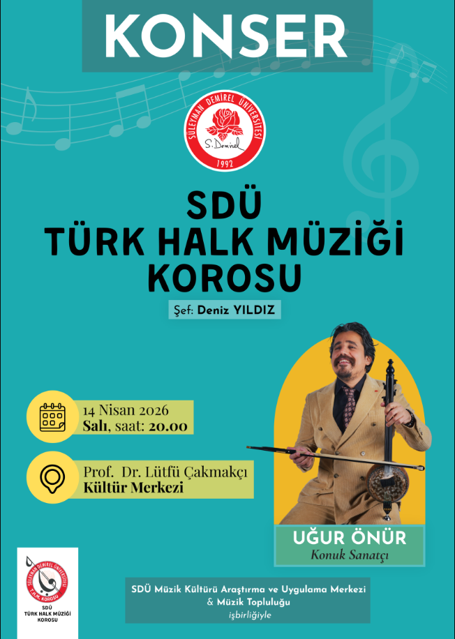 SDÜ Müzik Kültürü Araştırma ve Uygulama Merkezi ile Müzik Topluluğu iş birliğiyle kurulan ve üniversitemiz akademisyenleri, idari personeli ve öğrencilerinden oluşan “Türk Halk Müziği Koro Konseri", 14 Nisan Salı günü saat 20.00’de Prof. Dr. M. Lütfü Çakmakçı Kültür Merkezi’nde gerçekleştirilecektir.